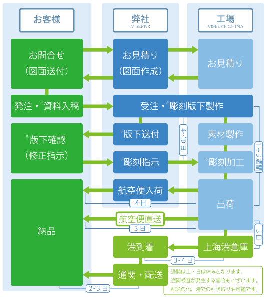 お急ぎの場合は、直送航空便にてお見積りさせていただきます。発注内容にも依りますが、2〜3週間程度での納品も可能です。